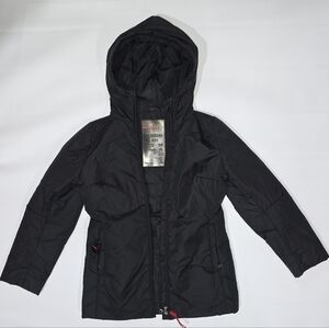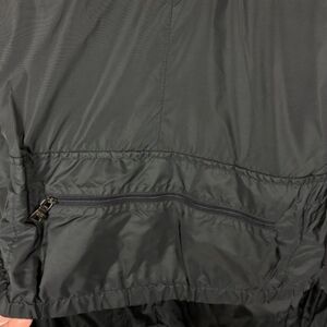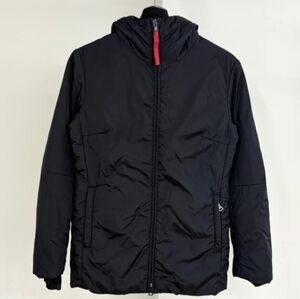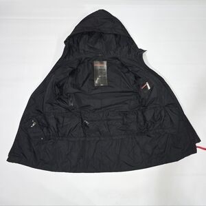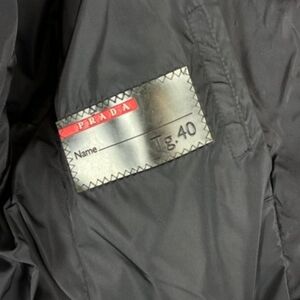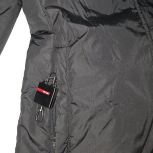 Features a concealed hood, a snow belt, front pockets secured with branded zippers, and additional waist pockets designed for snow gear. The zipper pull is adorned with Prada branding, and the jacket includes a charming Prada logo padlock-shaped keychain, perfect for holding your ski pass. This jacket is a stylish and practical companion for your winter adventures.