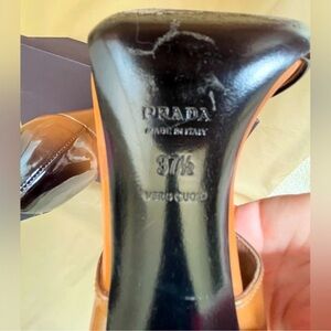 PRADA Patent Leather Banana heels open toes Tan/ Black EUC. Size 37.5 WITH BOX