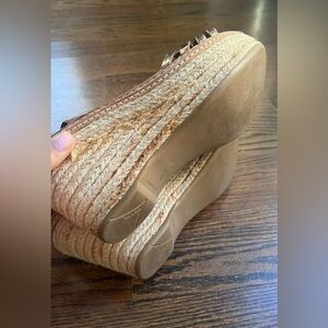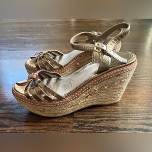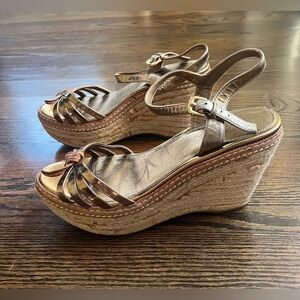 PRADA Patent Leather Espadrille Wedge Sandals Sz. 37 Gold/Brown Bow Accent