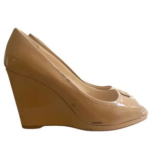 Nude patent wedges elongate the leg and work with everything—weddings, office, brunch. The wedge keeps them steadier than stilettos and the peep toe adds a little glam.