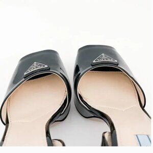 Patent leather style decorated with the iconic enameled metal triangle logo, which first appeared in 1913 on trunks designed by Mario Prada. Preowned condition. Light signs of wear on uppers and insoles. Wear on insoles, including a few imperfections and marks on insoles. Wear on soles, including black marks on soles. Light wear on heels, faint imperfection on patent. No box, no dustbags.