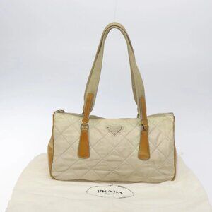PRADA Quilted Hand Bag Nylon Beige Silver Auth