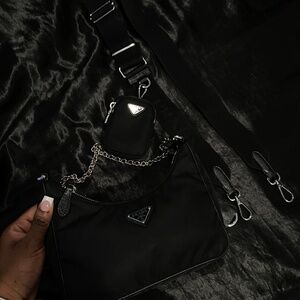 PRADA Re-Edition 2005 Re-Nylon Bag BLACK. This versatile bag with Saffiano leather trim comes with a detachable pouch attached to the shoulder strap.