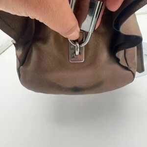 Discover the allure of the Prada Rovere Mordore Nappa Leather Bauletto Bag, now available in our store. Crafted from metallic bronze Nappa leather, this bag exudes elegance with its intricate ruffle detailing and striking silvertone Prada padlock. Despite showing signs of use, such as rubbing on corners and minor creasing on the leather ruffles, it maintains its allure. The handles exhibit slight wear, yet the hardware retains its brilliance with only minor scuffs. Inside, the spacious interior offers ample room for your everyday essentials. Whether it's a day out or a night on the town, this bag is the perfect companion.
