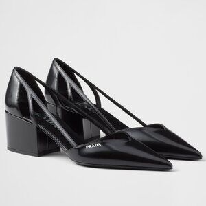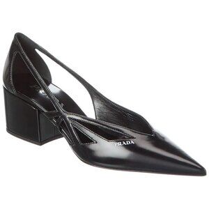 PRADA Runway Pointed Toe Cutout Cut Out Block Heel Brushed Leather Pumps