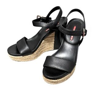 • PRADA SIZE 6 WEDGE PLATFORM BLACK LEATHER ANKLE WRAP SANDALS