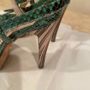 Soft green and black skin sandal w 5" heel. Unique striped wood heel. Worn maybe twice. Actual size 39.