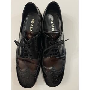Elevate your style with these Prada Spazzolato Fume Nero Bruciato leather loafers. The sleek brown and black design is perfect for any occasion, whether traveling, casual outings, or even workwear. The lace-up closure ensures a comfortable and secure fit, while the leather outsole material adds to the shoe's durability.