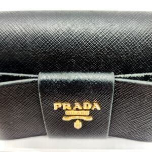 PRADA Saffiano Bow Continental Wallet in Black Saffgiano cross grain leather with a structured bow accent on the facing flap and zippered pocket on the backside of the wallet. The front flap opens to a matching partitioned leather interior with a central zipper pocket, card slots, and bill slots. Shows some signs of wear on the leather bow. See pictures. Overall, in good condition. See pictures Base Length 7.5" Height 3.5" Width 1"