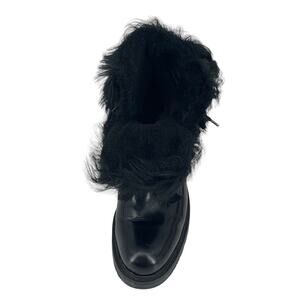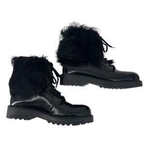 Prada black leather and fur platform combat boots size 38. Made of bull hide leather and fur, these boots are in great pre owned condition with light signs of wear. Moderate creasing. Inside is shearling and longer fur on the upper cuff