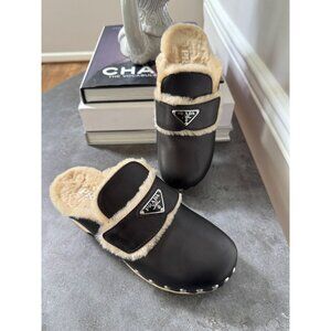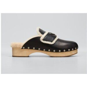 PRADA Shearling Lined Studded Leather Logo Mule Clogs in Black Size 39 9
