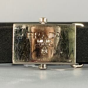 PRADA belt in a stretchy black nylon canvas featuring a silver tone metal box buckle with debossed logo.
