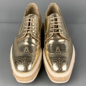PRADA shoes comes in a gold metallic perforated leather featuring a wing tip style, jute trim rubber platform, square toe, and a lace up closure. Made in Italy. Includes dust bag.