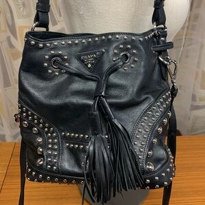 PRADA Soft Calf Black Leather Studded Bucket Bag Red Leather Interior
