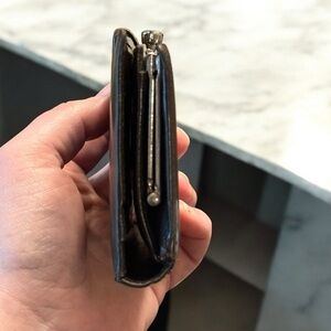 Notable signs of wear include light scuffing that you see as tiny white specs, and edge wear throughout, minor discoloration to the leather exterior, visible creasing, and interior lining wear at the coin compartment. However, the interior is rather clean for its age. The hardware shows some tarnish consistent with age. Remember, this is vintage from the late 1990s. Despite its flaws, the wallet retains its structure and high-end elegance—perfect for lovers of vintage Prada style.