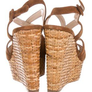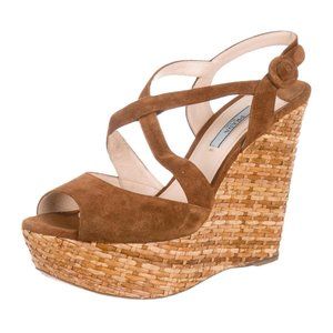 Cinnamon suede Prada platform wedge sandals with tonal stitching, crossover straps at tops, straw covered platforms and heels and buckle closure at ankles. Includes box.