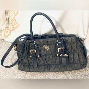 Beautiful PRADA Tessuto Gaufre (Nylon Gathered) Gray convertible bag. Can be carried by its double handles, or as a shoulder bag or crossbody with the removable/adjustable strap. Gray "gathered" nylon with darker gray leather accents. Includes the hangtag. Hard to find in this size/color/condition. Measures approximately 15" wide at bottom and 12" wide at top (zipper closure); 7.5" high; 4.5" depth at bottom. Gold-tone hardware; bottom feet. Interior has three open leather slip pockets, and one side zip pocket. This bag is gorgeous in person and in great condition. Corners show no wear. Comes with COA. Cross-posted.
