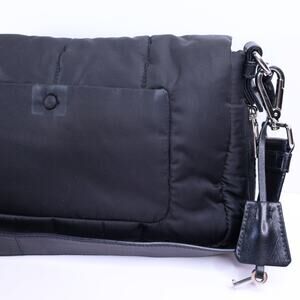 Soft, vertical quilted nylon crossbody bag with a removable leather strap and expands with a bottom zipper. It features a front push-lock closure with silver hardware, leather trim, a full lining, two inside pockets (one zippered, one open), and an outer snap pocket. It includes documents and a spare key. Only one previous owner.