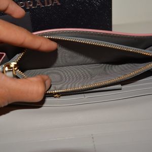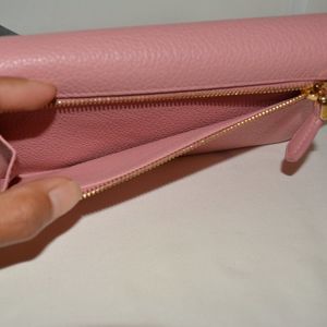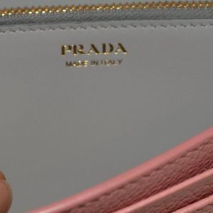 - Prada continental wallet in textured leather.