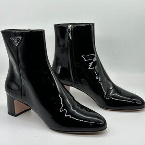 PRADA Triangle Logo Patent Leather Block Heel Ankle Booties Boots Shoes