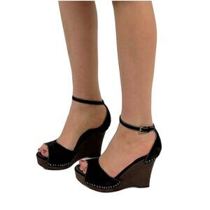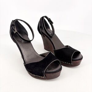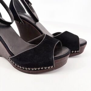 PRADA | Vintage Suede Studded Peep-Toe Wood Wedges in Black | 6
