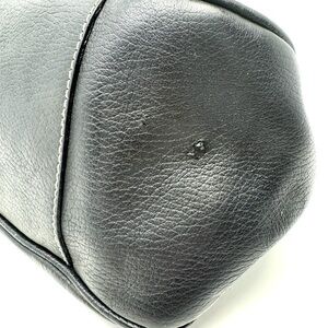 The bag is beautifully crafted of soft and beautifully textured black calfskin deer leather. The bag has a leather shoulder strap with polished brass hardware including handle rings and a luggage tag.