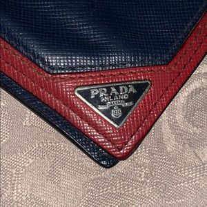 Navy blue and red Prada Milano wallet comes with silver money clip that can be used alone or in combination with the leather card holder casing
