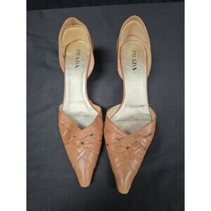 PRADA Walnut Brown Woven Leather Pointed Toe d'Orsay Wood Heel Pumps 39.5. Condition is Pre-owned - Good. Shipped with USPS Ground Advantage.