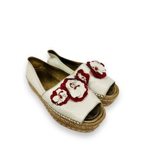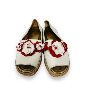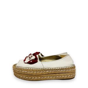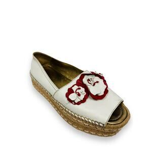 PRADA White Leather Floral Appliqued Peep Toe Platform Espadrilles Flats 38.5