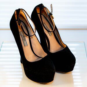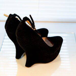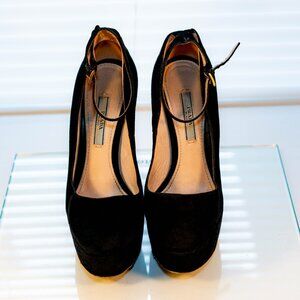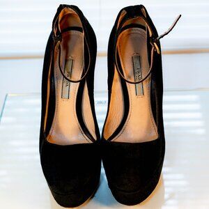 PRADA Women Black Pumps Suede Solid Ankle Strap Wedge High Heels Shoes EU 37