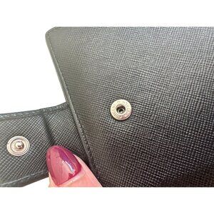 This PRADA Women's Black Saffiano Leather Snap Wallet is a sophisticated and functional accessory. Crafted from durable Saffiano leather, it has a sleek black design, a snap closure, and plenty of storage for cards, cash, and coins.