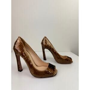 PRADA Womens Bronze Brown Metallic Sequin Peep Toe Pumps High Heels EU 35