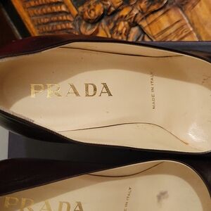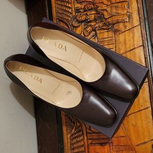 Gorgeous vintage Prada heels circa 90's, 2000. New in box. Size 38 equivalent to size 7 to 7.5 US size. Heel approx 3 -4 inches. Slight color difference between thectwo backheels. Pls look at all photos. Authentic.