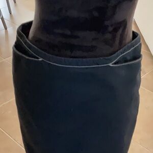 PRADA black denim skirt, back zip, back slit, white stitching, size 44
