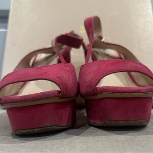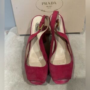 Fuchsia pink suede authentic Prada pumps. These beauties are classic with an added edginess. Suede could use a cleaning. Size 37.5, 4.5 inch heel with about 1 inch platform that is such a great detail.