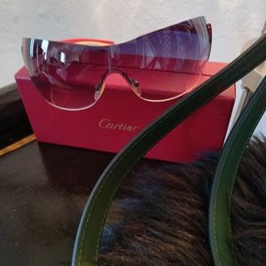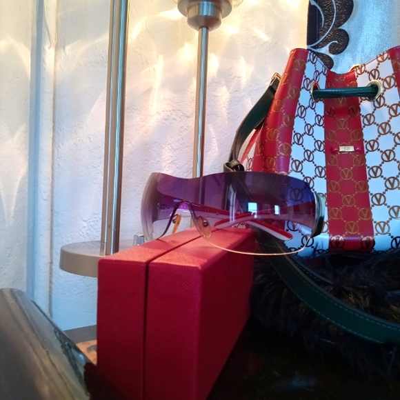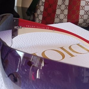 Prada gray lense sunglasses with beautiful white and red sides with name on silver chrome. Looks and feels amazing. Very light on face and OMG, definitely an attention grabber. I love it so much but ready for a change. Tiny non-visible scratch on glass and can be removed. Ask if you have any questions or need more photos.