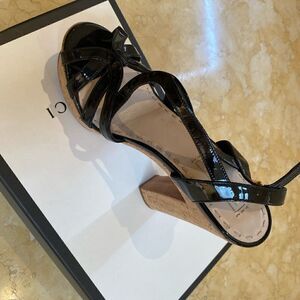 Prada Black patent platform sandal with Cork heel in size 40. Gently worn but in great condition. The heel measure 6 inches and the platform in front measures one and a half inches.