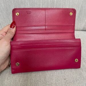 This is a preloved *verified* authentic Prada Fuschia Bow Saffiano leather crossbody wallet paired with removable adjustable offmarket chain. Auth cert incl. Logo in pics. Exterior leather dyed and sealed with protectant. All working hardware (buttons, zippers). Other minor imperfections exist - minor tarnish & scratches on hardware, coin stains in pouch. Fits iPhone 12 and 12 pro!! Comes with non-prada bag and box. pet & smoke free home