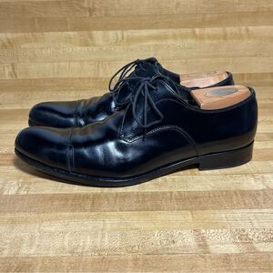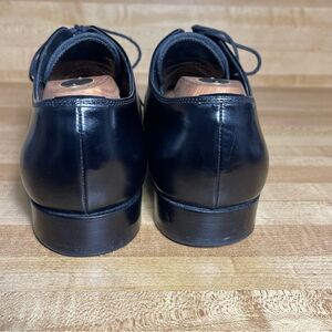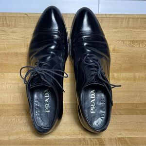 PRADA Graphite Patent Leather Dress Shoes Size 8 US 9 2EE black Almond Toe Derby. Good condition good tread, some creasing and wear near the toe caps