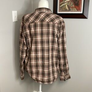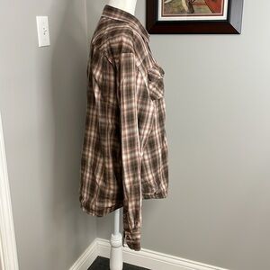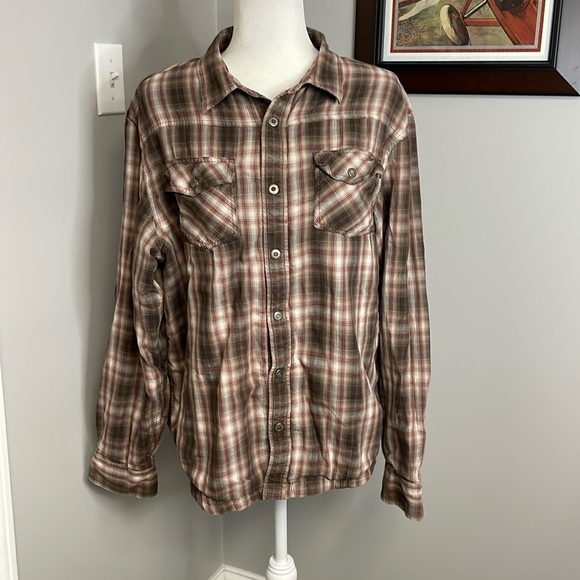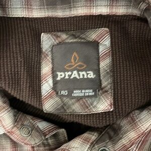 PRANA Thermal lined flannel Shacket. Plaid with brown and cream colors. Metal snap closure. 2 front snap pockets 85% organic cotton 15% poly. Pre owned & in excellent condition