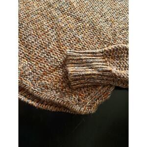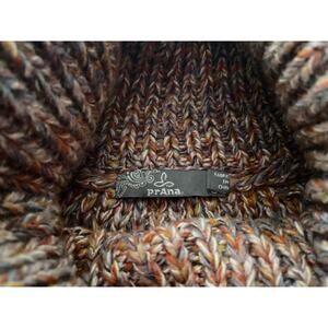 PRANA Brown Cable Knit Turtleneck Sweater size S. This stylish crop sweater features a mix of brown/gray/red/cream hues, ribbed collar/cuffs/waist and scallop hem w/side slits. Perfect for everyday casual wear.