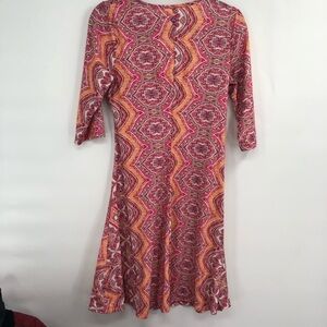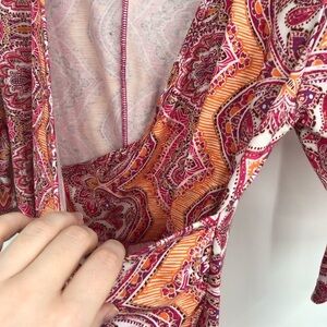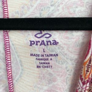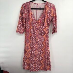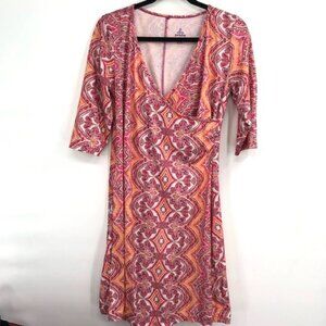 PRANA Nadia Surplice Faux Wrap Dress Pink Orange Print Stretch Cotton L Large