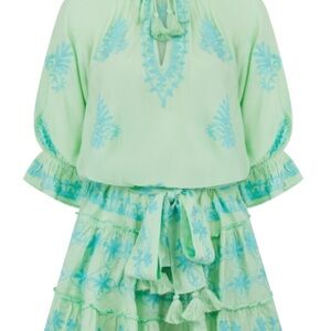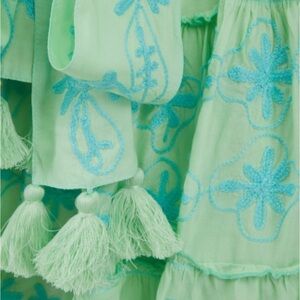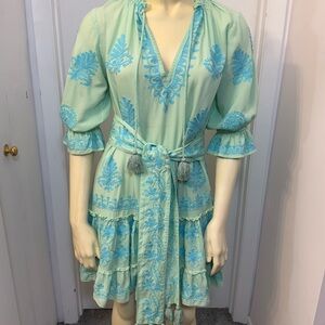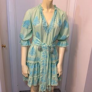 Stylish green dress with blue embroidery. Features a tie waist and tassel details.Excellent condition. No signs of wear.XS/S