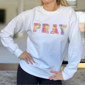 PRAY Gildan white crewneck with sparkle tie dye bold statement letters small