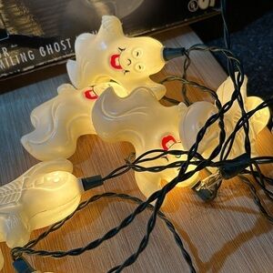Smiling ghost on 1 side and skeleton on the other side of the lights.
