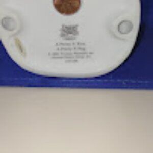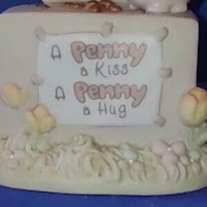 PRECIOUS MOMENTS, A PENNY A KISS A PENNY A HUG, PORCELIAN FIGURINE WITH PIGGY BANK, COINS AND SIGN, 2001, 1975 PENNY IMBEDDED ON BOTTOM, DISCONTINUED DESIGN, VINTAGE AND COLLECTABLE, I RECEIVED THIS AS A GIFT 2001 FROM A FRIEND, SHE'S HELD UP PRETTY WELL FOR NEARLY 25 YEARS. I WOULD LOVE TO KNOW SHE WILL BE LOVED ANOTHER 25!