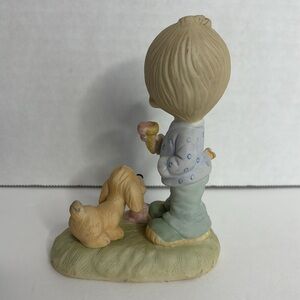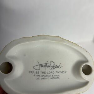 Dated 1976 vintage features darling little boy eating an ice cream cone with his dog. Slingshot in back pocket. Ice cream melted and drop on ground. Beautifully hand painted . Praise the Lord Anyhow. Excellent condition