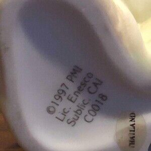 On the bottom of the figurine reads " c) 1997 PMI Lic. Enesco Sublic, CAL c0018" and there is a symbol that looks like a pencil with a line through it on the corner of the figurine.