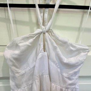 Details: White linen blend maxi dress from A&F. Features a keyhole at the bust knotted to create the halter neckline. Skirt is tiered. Back bodice has panel of smocking for stretch. Dress is fully lined, making it very opaque.