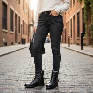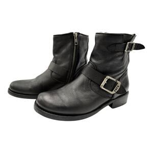 A dressier take on the iconic Engineer, this moto boot is handcrafted from soft full grain leather that's been beautifully polished. Silver double buckles uphold the collection's signature styling while the round toe and cleaner rubber bottom lend a touch of elegance to this boot's built-in attitude. - Leather lined- Rubber outsole- Antique silver hardware- 7" shaft height- 11 3/4" shaft circumference- 1" heel height